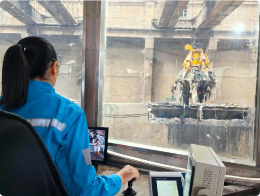 8月15日,在重慶海螺水泥有限責任公司,工作人員在操作機械臂進行垃圾處理作業。新華社記者 唐奕 攝