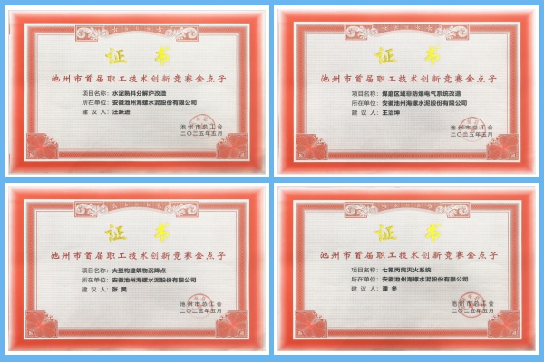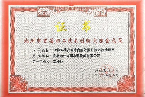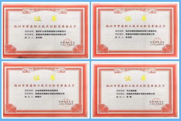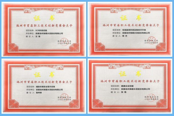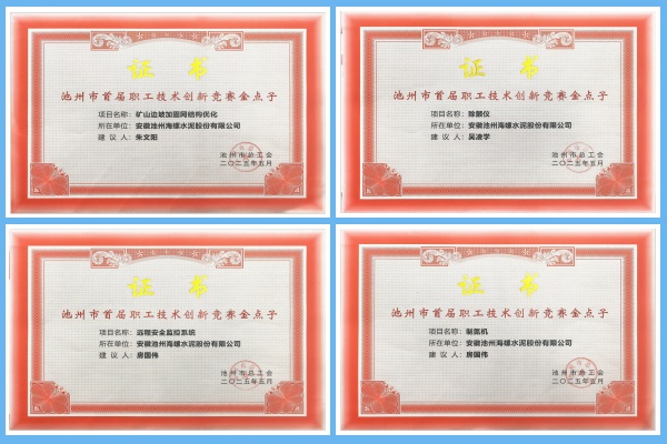 2025年11月,池州海螺榮獲池州市總工會頒發的多項證書嘉獎,以表彰其在池州市首屆職工技術創新競賽中所取得的優異成績。